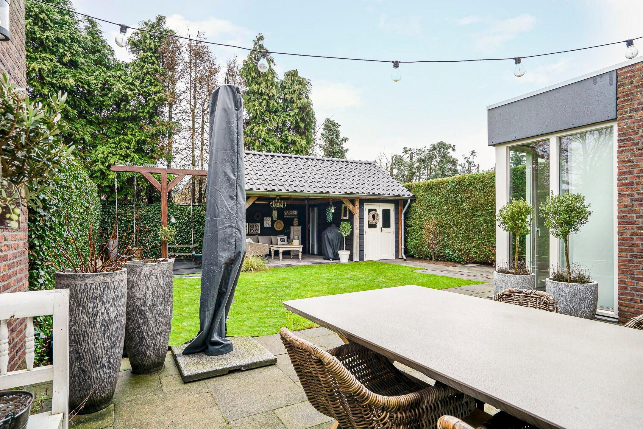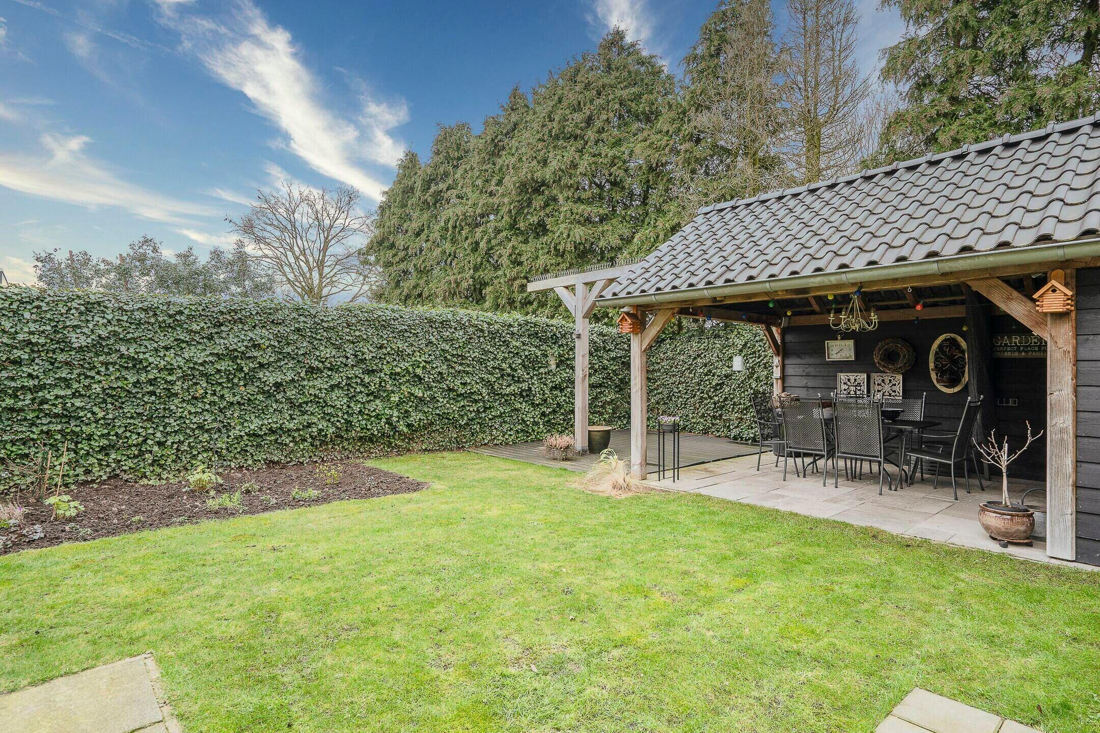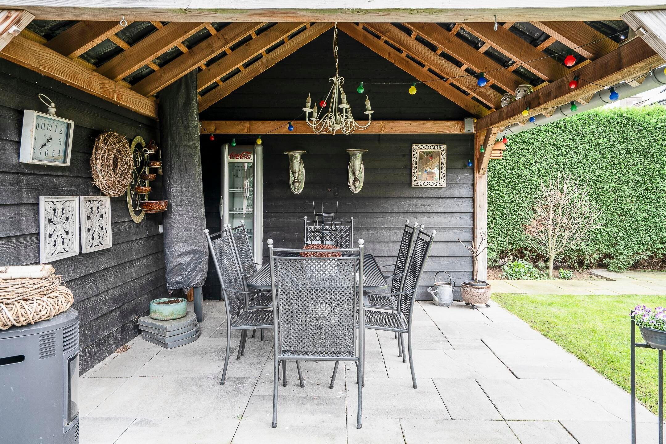 De buitenruimte is net zo aantrekkelijk als het interieur. De mooi aangelegde tuin biedt veel privacy, compleet met een vrijstaande terrasoverkapping met geïntegreerde buitenberging. Een ideale plek om te ontspannen of gezellige avonden door te brengen met vrienden en familie.